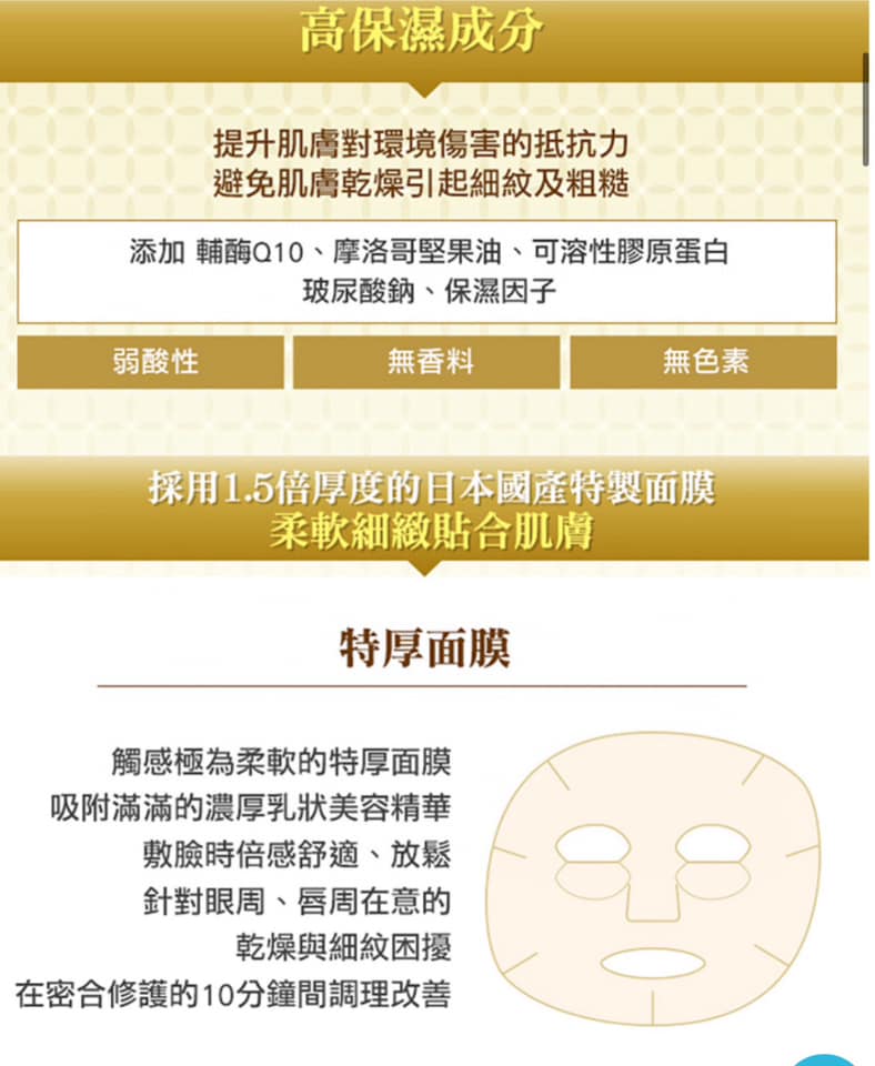 ➰深層抗衰老修護高保濕成份添加,極滋潤保濕精華滲透至角質層,深度水養滋潤,改善全面乾燥細紋及收細毛孔,令細胞飽滿光澤,使用100%日本天然素材並加厚1.5倍面膜紙,令美容液更滲透至肌膚美肌效果更顯著